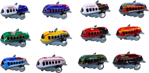 Uživajte u satima kreativnosti i zabave s ovim setom od 12 igračaka u obliku aviona. Svaki model ima pogon i kotače za igru kotrljanja. Šareni avioni s opisima poput "High Wind" i "Air Transport" inspiriraju dječju maštu.