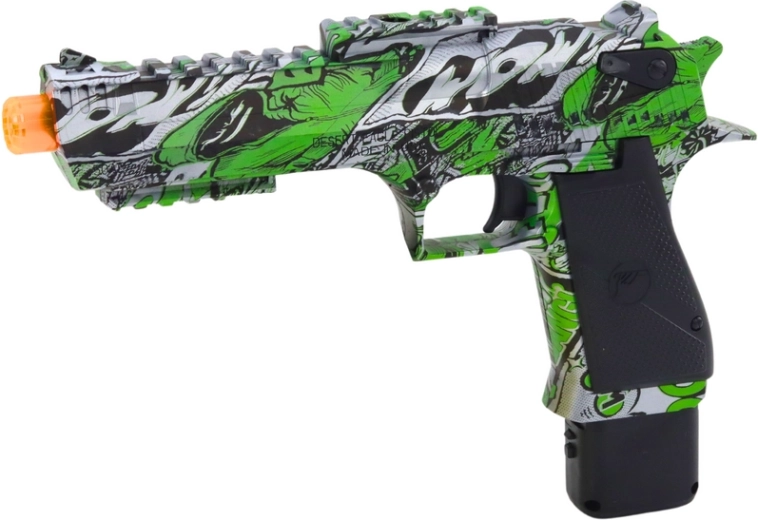 Pištolj se ističe dinamičnim kolorističkim dizajnom – izveden je u intenzivnoj zelenoj boji koja mu daje energiju i privlačnost. Osim toga, ukrašen je srebrnim elementima koji mu daju futuristički i moderan izgled. Dodatno, cijeli je dizajn ukrašen grafitima, što mu daje urbani karakter i jedinstveni stil koji privlači pažnju i izdvaja ga od ostalih igračaka.