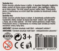 Plastično kazoo izvrstan je način da djecu i početnike upoznate sa svijetom glazbe. Sviranje je iznimno jednostavno – umjesto puhanja dovoljno je pjevušiti u usnik i kazoo stvara karakterističan zujavi ton. Zahvaljujući kompaktnoj duljini od 12 cm, lako stane u džep i uvijek je pri ruci.