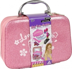 Otkrijte čarobni set za male stilistice – kompaktan ružičasti svjetlucavi koferčić pun dodataka za nokte. Zahvaljujući lakom patentnom zatvaraču, čvrstoj ručki i ogledalu unutra, djeca mogu sigurno i udobno stvarati svoje prve kreacije na noktima bilo gdje. Set uključuje 4 laka u boji, pločicu za pečatiranje, naljepnice i kamenčiće, razdjelnike za prstiće i druge pomagala za kreativno ukrašavanje noktiju.
