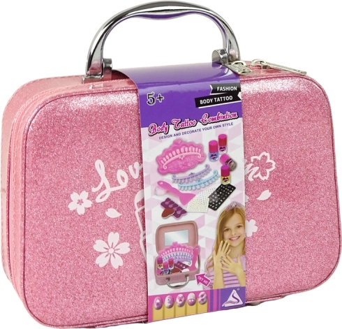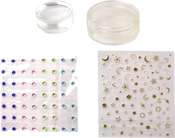 - Ružičasti svjetlucavi koferčić s ogledalom, 4 laka za nokte u boji, razdjelnik za prste, rašpica, pečat, pločica za pečatiranje s uzorcima, strugalica/špatula, 3 šablone za tipse, naljepnice za tipse, samoljepljive naljepnice i kamenčići, mali spremnik