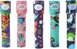 Dovoljno je pogledati kroz leću i sve oko vas pretvara se u šarene oblike. Svako okretanje kaleidoskopa stvara nove šarene, simetrične uzorke koji fasciniraju te potiču znatiželju i koncentraciju. Bijeli tubus sa životinjskim motivom djeca će odmah zavoljeti.