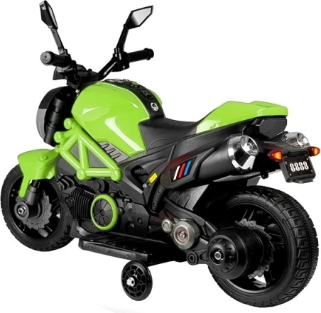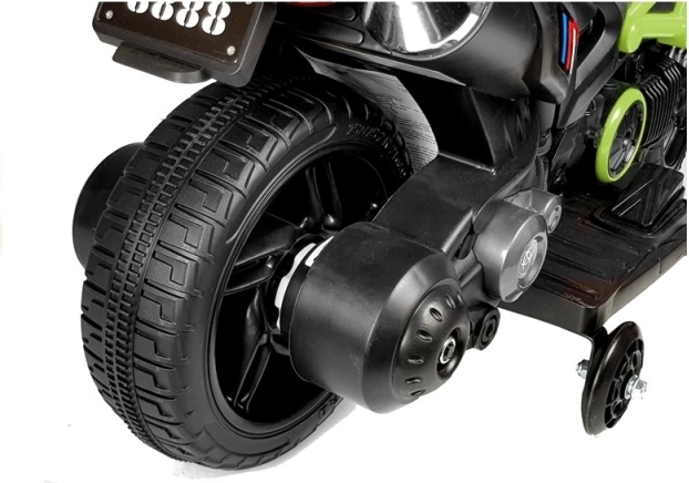 Model GTM1188 izdvaja se robusnim tijelom bez nepotrebnih otvora, pa djeluje čvrsto i pouzdano unatoč kompaktnim dimenzijama. Integrirani oslonci za noge pojačavaju osjećaj stabilnosti, dok skriveni bočni kotačići ne narušavaju dizajn i nenametljivo pomažu održavanju ravnoteže početnika. Motor je opremljen retrovizorima, dvostrukim završetkom ispuha i držačem za dječju registracijsku pločicu.
