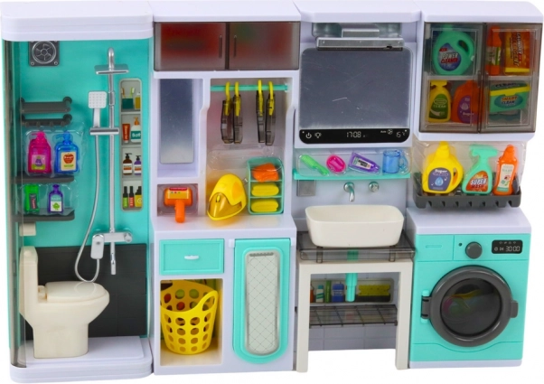 Tuš s WC-om, umivaonik s ogledalom, perilica rublja s ormarićem i police s daskom za glačanje čine zaokruženu cjelinu za igru za raznoliku igru kućanstva.