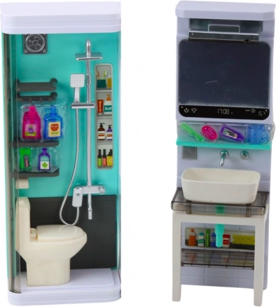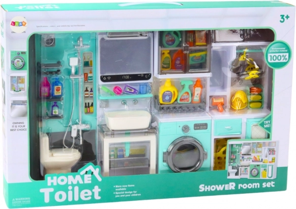 Ovaj promišljeni set sastoji se od 4 međusobno povezana segmenta: tuš-kabine s WC-om, umivaonika s ogledalom, perilice rublja s ormarićem te polica s daskom za glačanje. Tirkizno-bijeli dizajn i precizna izrada potiču maštu i motiviraju djecu na oponašanje svakodnevnih aktivnosti. Dimenzije kompleta 35 × 26 × 8 cm savršeno pristaju dječjoj sobi i kućici za lutke.