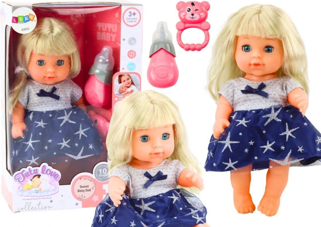 Elegantna lutka u mornarskoj haljini s dugom plavom kosom nudi mogućnost češljanja i oblikovanja u različite frizure. Njena realističnost je podržana pokretnim udovima i očima koje se zatvaraju, oponašajući bebu koja zatvara oči pri spavanju.
