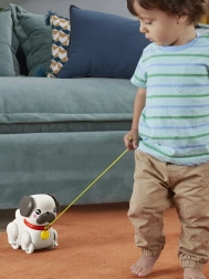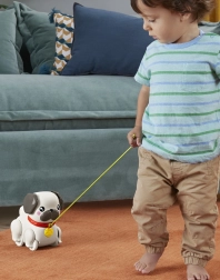 Upoznajte povlačnog mopsića koji svaki djetetov korak pretvara u zabavnu pustolovinu. Dovoljno je uzeti povodac u ruku i psić će se „pokrenuti“ – uške i šapice ritmički se miču, a čuje se prijateljsko lajanje. Idealan je za djecu od 12 mjeseci koja otkrivaju hodanje i svijet oko sebe.