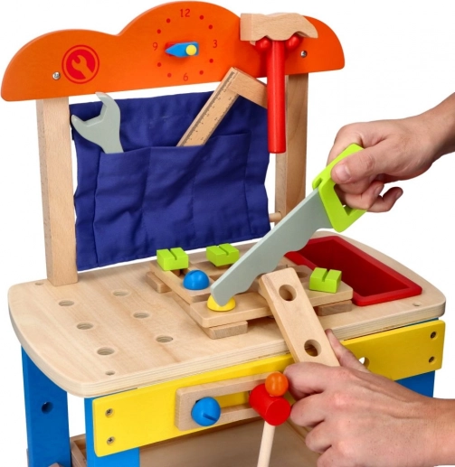 Čvrsta radna ploča, tekstilni džepići i kuke drže alat nadohvat ruke. Visina do radne plohe 34 cm udobna je za malu djecu.