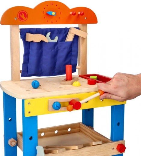 Ova kvalitetna drvena radionica dizajnirana je da djecu sigurno upozna sa svijetom alata. Šareni detalji, funkcionalni elementi poput vijaka, matica i zupčanika te praktična ladica za alate potiču prirodnu znatiželju i razvoj vještina.