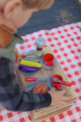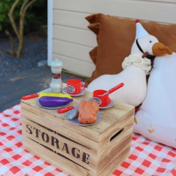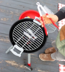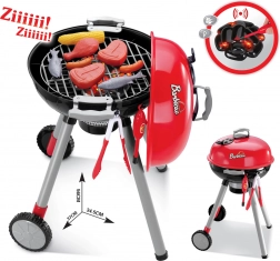 Set sadrži sve potrebno za imitaciju obiteljskog BBQ-a: utori na rešetki, bogat izbor plastičnih namirnica (kobasice, odresci, piletina, ribe, kukuruz, patlidžan), pribor, tanjuriće, čaše i čak mlinac za papar. Odvojivi poklopac štiti rešetku nakon “roštiljanja”, a zahvaljujući kotačićima i ručki djeca roštilj lako premještaju na terasu ili u dječju sobu.