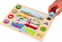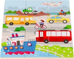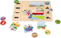 Zahvaljujući čvrstom drvu i glatkim rubovima, igra je sigurna od 18 mjeseci. Vesele boje i jasni oblici zaokupljaju pažnju te pomažu bolje upoznati automobile, autobuse, brodove, zrakoplove i druga prijevozna sredstva. Nakon dovršetka dijete može imenovati vozila i potražiti ih na velikoj slici – izvrsna aktivnost za razvoj govora.
