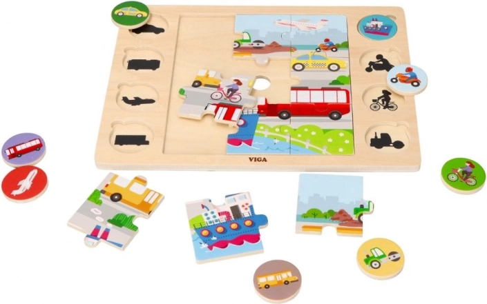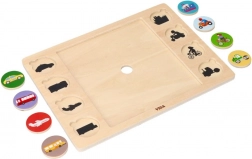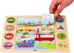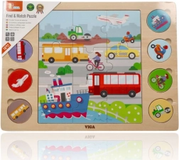 Drveni set puzzli VIGA „Pronađi i pridruži – prijevozna sredstva” spaja radost igre s pametnim učenjem. U sredini slažete 9 velikih dijelova u sliku, a zatim dijete pridružuje 8 okruglih žetona s vozilima njihovim siluetama na ploči. Podržava prirodno učenje kroz igru i jača samopouzdanje djeteta pri svakom točnom pridruživanju.