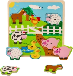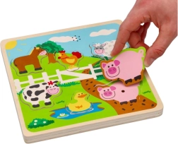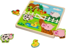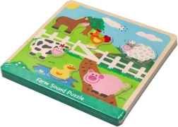 Drvene zvučne puzzle s motivom farme donose djeci prvo istraživanje oblika, boja i zvukova. Svaki dio predstavlja poznatu domaću životinju, a nakon umetanja na pravo mjesto čuje se karakterističan zvuk koji potiče prirodnu znatiželju i koncentraciju.