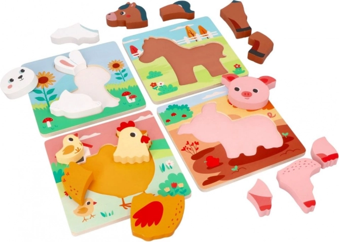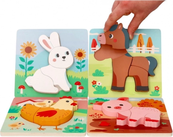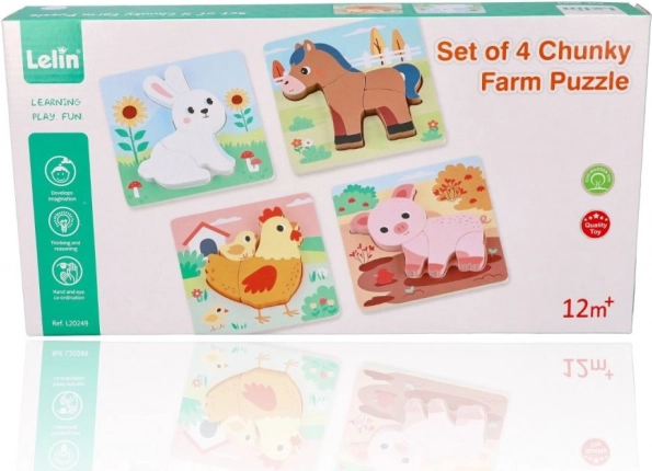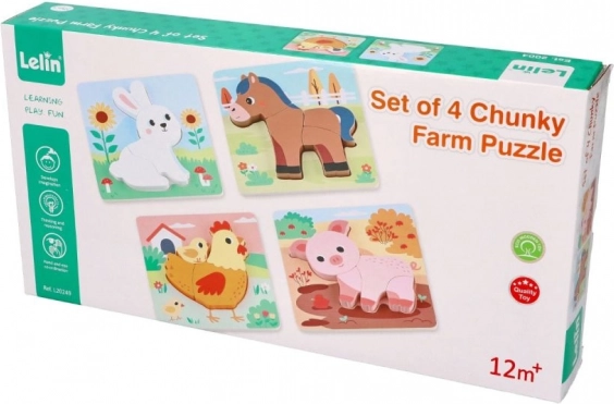 Otkrijte učenje kroz igru uz ovaj set od četiri drvene slagalice s motivima farme – zečić, konj, pilić i praščić. Svaka slagalica ima čvrste, “chunky” dijelove idealne za male dječje ruke i šarene podloge koje potiču prepoznavanje oblika i životinja.
