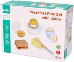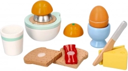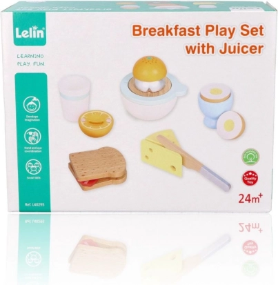 Drveni set za doručak za male kuhare donosi sve za realističnu igru kuhanja – tost, jaje u čašici, sir, ručno cijeđilo za sok s narančom, šalicu i siguran drveni nožić. Od 24 mjeseca potiče finu motoriku, kreativnost i igre uloga uz kvalitetnu i izdržljivu izradu.