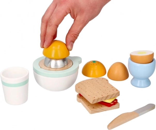 - Kompletni dodaci za doručak: tost, sir, jaje u čašici, šalica, drveni nožić i funkcionalno ručno cijeđilo s narančom.
