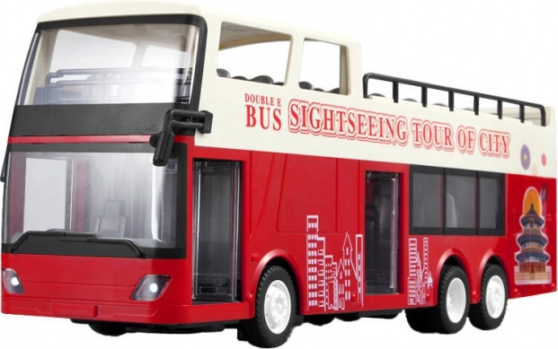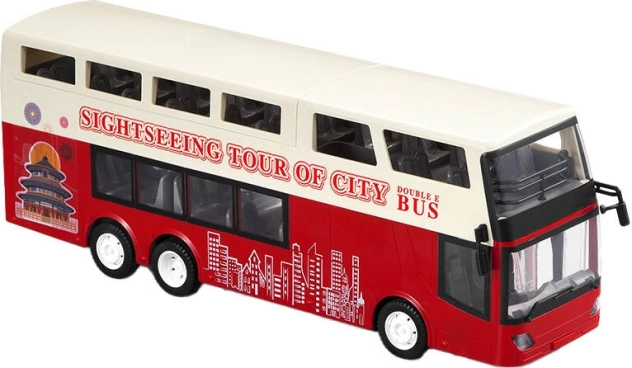 Autobus je izveden u izražajnim crvenim i bijelim bojama s impresivnim detaljima kao što su otvoreni krov i ilustracije gradskih znamenitosti.