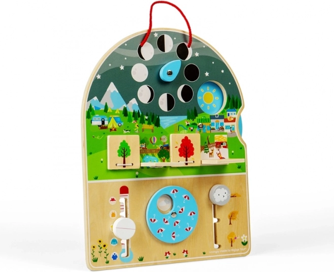 Ova interaktivna drvena ploča idealan je alat za djecu koja su zainteresirana za prirodu i žele bolje razumjeti što se događa u našem svijetu. Izrađena od kvalitetnog i odgovorno dobivenog drva, ploča nudi razne elemente edukacije koji prikazuju različite meteorološke uvjete: sunčano, oblačno, kiša, snijeg i vjetar.