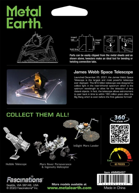 Ovaj 3D metalni model teleskopa Jamesa Webba ističe se preciznim laserskim graviranjem i realističnim detaljima, uključujući ikonično zlatno segmentirano zrcalo i konstrukciju sunčeve zaštite. Sastavljanje zahtijeva strpljenje i pažljivost, no nagrada je dojmljiv kolekcionarski komad za izlaganje.