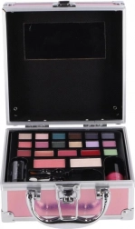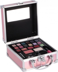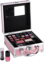 Stilizan ružičasti mini koferić za šminku za svakodnevnu i putnu uporabu. Sadrži sve što vam treba za brzi make-up: 14 sjenila za oči, svjetlucave boje za usne, rumenilo i puder, ruž te lak za nokte. Praktično ogledalce, kist za rumenilo, spužvasti aplikator i kist za usne osiguravaju udobnu aplikaciju kod kuće i na putu.