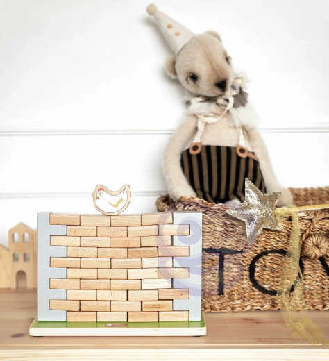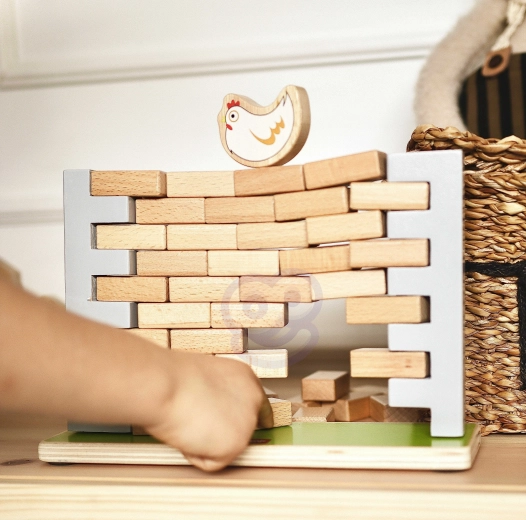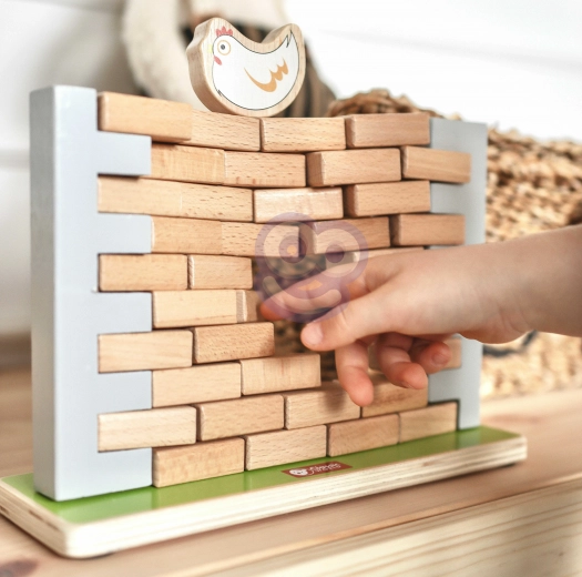 Ova kvalitetna drvena balansirajuća igra nudi jednostavna pravila i puno uzbuđenja. Cilj je vaditi ciglice iz zida tako da kokoš na vrhu ne padne. Djeca vježbaju strpljenje, koncentraciju i rješavanje problema dok se zabavljaju s roditeljima ili braćom i sestrama.