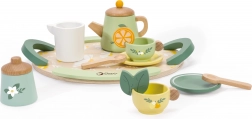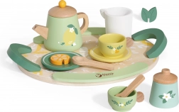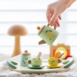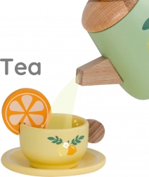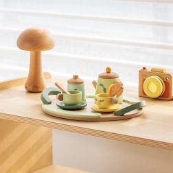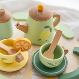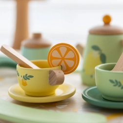 Priredite djeci čarobni čajni obred s elegantnim drvenim setom u nježnim pastelnim nijansama. Set je ukrašen voćnim i cvjetnim motivima te sadrži čajnik, šalice s tanjurićima, žličice, posudice za mlijeko i šećer te veliki pladanj s ručkama za lako prenošenje.