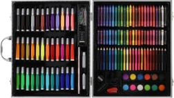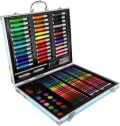 150 komada raznih umjetničkih pomagala uključujući flomastere, bojice i boje, pažljivo organiziranih za jednostavan pristup kreativnosti.