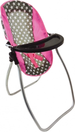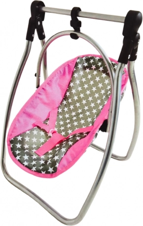 Ovaj praktičan set spaja dvije omiljene igračke u jednu: u trenu pretvorite ljuljačku u hranilicu zahvaljujući odvojivom gornjem luku i priloženom stoliću. Čvrst metalni okvir, plastične spojnice i kvalitetna tekstilna navlaka s uzorkom zvjezdica osiguravaju sigurnost i udobnost za lutku.