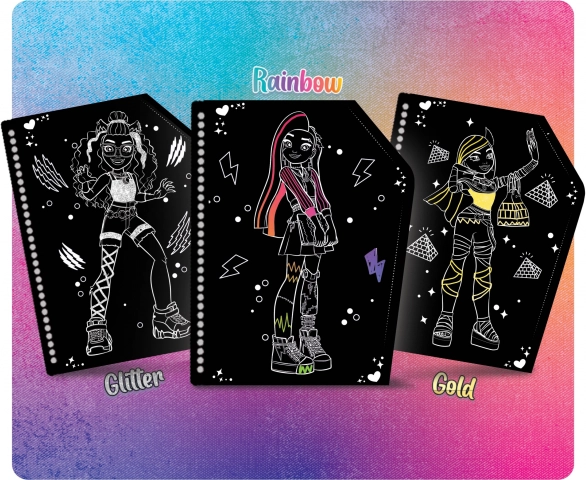 Uđite u čarobni svijet Monster High i stvarajte uz strugalica skicir, gdje ćete nakon uklanjanja crnog sloja otkriti zlatne, sjajne i dugine efekte. Skicir nudi 44 stranice pune kreativne zabave.