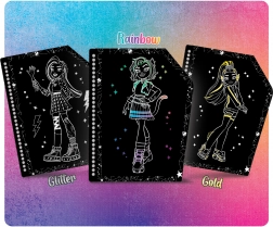Stvarajte originalne slike svojih omiljenih likova iz MONSTER HIGH i promatrajte kako se ispod crnog sloja pojavljuju žive boje. Zahvaljujući trima vrstama efekata – zlatnom, brokatnom i duginom – svako će djelo biti jedinstveno i blistavo.