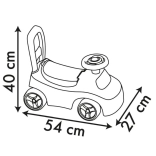 Praktični spremnik ispod podiznog sjedala prima sitne igračke ili blaga malog putnika. Volan s trubom potiče igru, tih hod kotača prikladan je i za interijer. Laka plastična konstrukcija lako se prenosi i odolijeva svakodnevnoj upotrebi.