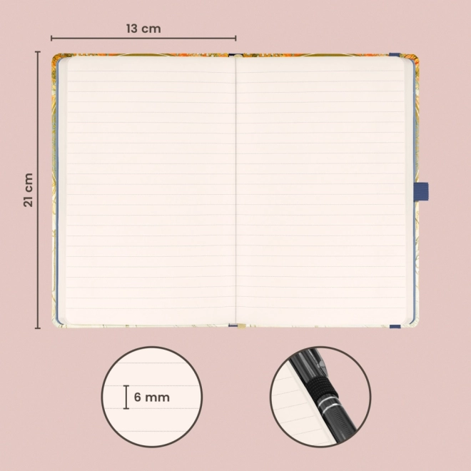 Elegantna linirana bilježnica s motivom Alfons Mucha – Glazba u čvrstim koricama nudi praktično zatvaranje s gumicom, petlju za olovku i unutarnji džep za sitnice. Unutra se nalazi 172 stranice na ugodnom žutom papiru, idealno za dnevnik, poslovne bilješke i zapisivanje ideja.