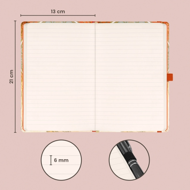 Elegantni linirani notes s motivom Alfonsa Muche – Slikarstvo u čvrstim koricama nudi praktično elastično zatvaranje, petlju za olovku i unutarnji džep. Unutra je 172 stranice na ugodnom žućkastom papiru, idealno za bilješke, dnevnik i radne misli.