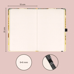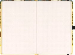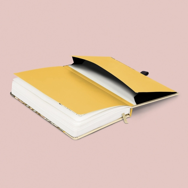 Elegantna bilježnica s motivom djela Alfonsa Muche u tvrdim koricama nudi 172 točkastih stranica na žutom papiru, elastično zatvaranje gumicom, unutarnji džep za sitnice i petlju za olovku – idealno za bilješke, planiranje i kreativno skiciranje.