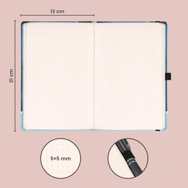 Elegantna bilježnica s motivom djela Alfons Mucha – Luna u tvrdim koricama. Nudi točkasti raspored za kreativne zapise, elastično zatvaranje, džep za sitnice i petlju za olovku. Unutra je 172 stranice na ugodnom žutom papiru veličine 13 × 21 cm – idealno za planiranje, bullet journal i skiciranje.