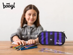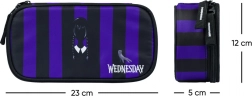 Stilisan školski pernič BAAGL s motivom WEDNESDAY u crno‑ljubičastim prugama nudi čvrstu konstrukciju, pregledan unutarnji raspored s preklopnom pregradom i praktičan džep na patent. Idealan za školu i putovanja, bez punjenja – spreman za personalizaciju prema vašim potrebama.