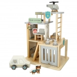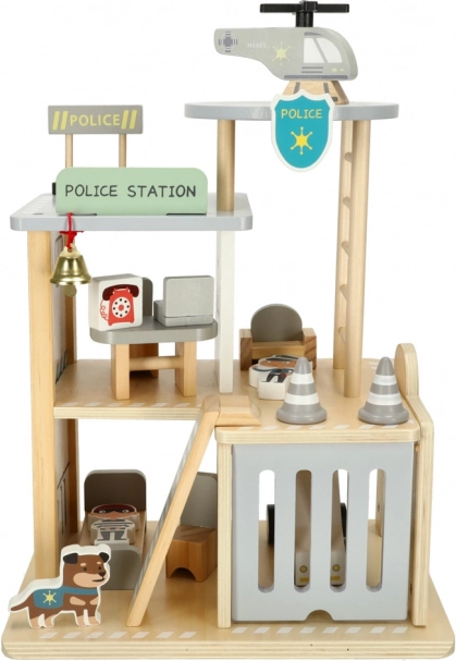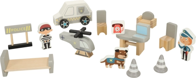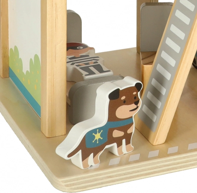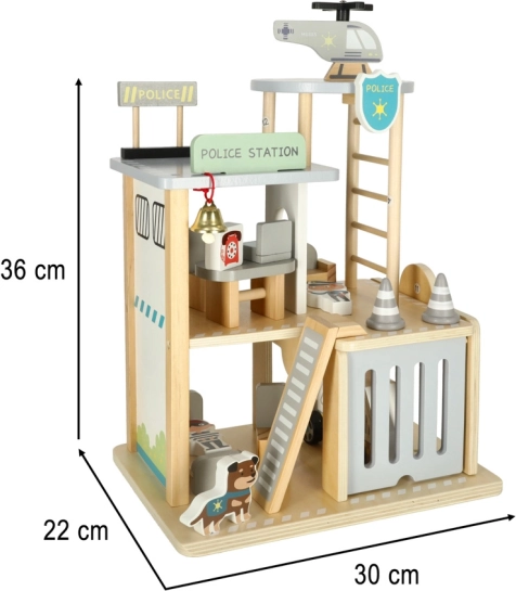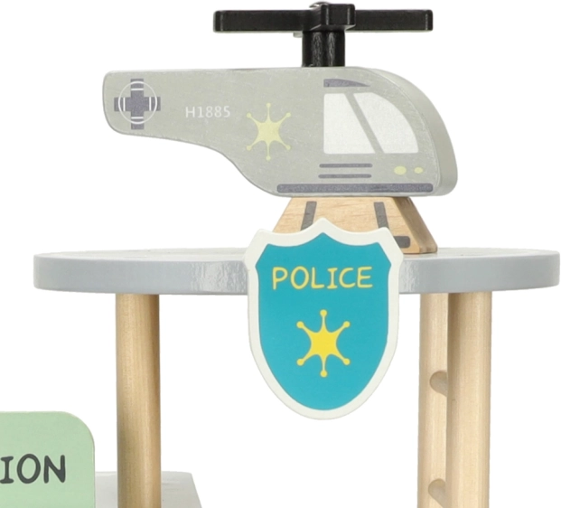 Ovaj promišljeni drveni set prenosi djecu u svijet spasilačkih akcija. U prizemlju je garaža za policijski automobil i ćelija za lopova, na srednjoj etaži ured zapovjednika, a na krovu heliodrom za brze intervencije. Glatko obrađeno drvo osigurava sigurnu manipulaciju i dug vijek trajanja igračke.