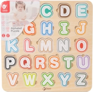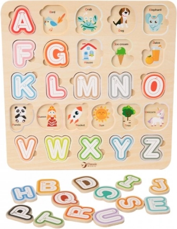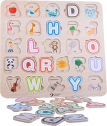 Ova kvalitetna drvena abeceda dimenzija 30 × 30 cm podržava prve korake prema čitanju i pisanju. Djeca umeću šarene izvadive dijelove u odgovarajuće oblike, čime vježbaju koordinaciju oko–ruka i prostornu maštu. Zahvaljujući sličicama ispod slova, na razigran način upoznaju i engleske riječi.