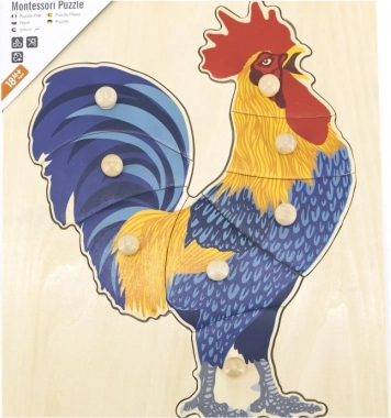 Ova drvena slagalica s pijetlom osmišljena je za prve logičke igre i osjetilno istraživanje. Djeca slažu sliku ne samo prema ilustraciji, već i prema obliku pojedinih dijelova, što jača prostornu percepciju i koncentraciju. Gumbić ručkice na svakom dijelu olakšavaju hvatanje i najmanjim prstićima.