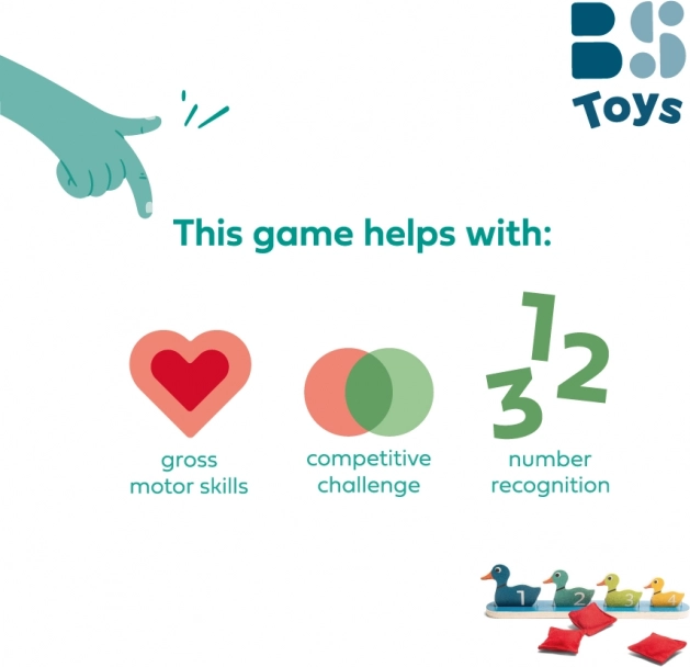 Zabavna i jednostavna vještinska igra za 1–4 igrača od 3 godine naviše. Posložite patke u red i pokušajte ih srušiti bacanjem malih vrećica. Idealno za obiteljsku zabavu i dječje rođendane – razvija grubu motoriku, strateško razmišljanje i potiče prijateljsko natjecanje.