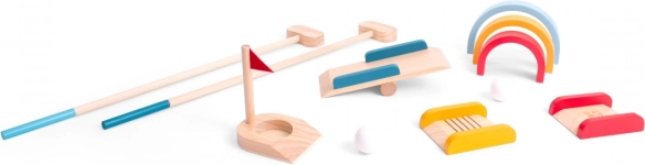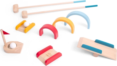 Otkrijte čaroliju minigolfa u dječjoj veličini. Ovaj kvalitetan drveni set donosi jednostavnu igru za 1–4 igrača od 4 godine naviše. Zahvaljujući jednostavnom slaganju i raznobojnim preprekama, djeca će uživati u aktivnoj zabavi vani i kod kuće te prirodno jačati finu motoriku i zapažanje.