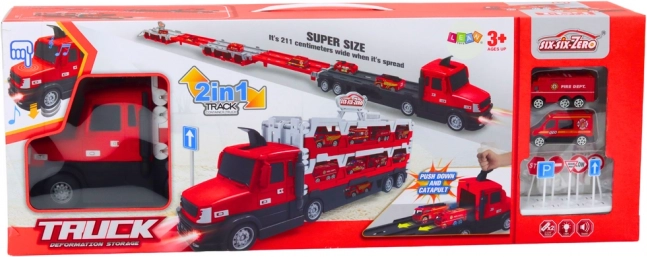 Teretni autotransporter 2-u-1 s izvlačnom trkaćom stazom, svjetlima i zvukovima – crveni