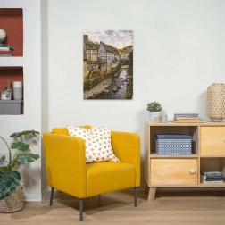 Detaljne poludrvene kuće, kameni temelji i vodeni kotač uz rječicu tvore harmoničnu scenu koja će nakon slaganja lijepo istaknuti interijer kao dekoracija.