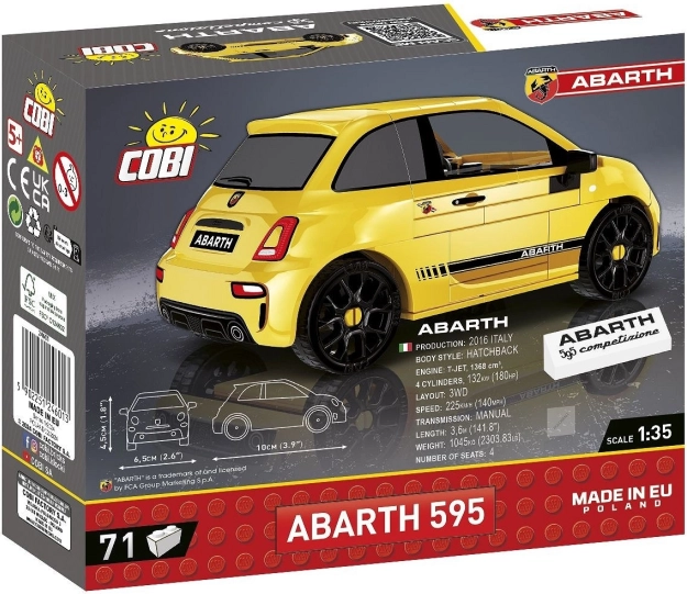 Licencirani model od COBI kocaka prikazuje ikonični automobil ABARTH 595 Competizione u mjerilu 1:35. Nudi 71 visokokvalitetnih dijelova s izdržljivim otiscima, okretne kotače s gumama i kompatibilnost s drugim markama. Idealan kao kolekcionarski model i zabavna slagalica za male i velike ljubitelje automobila.