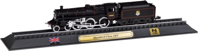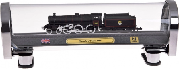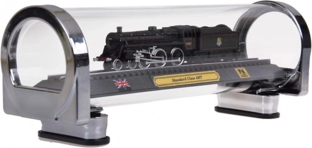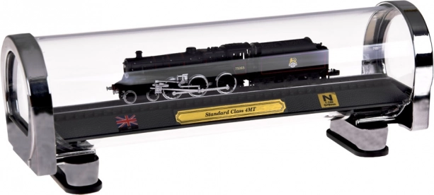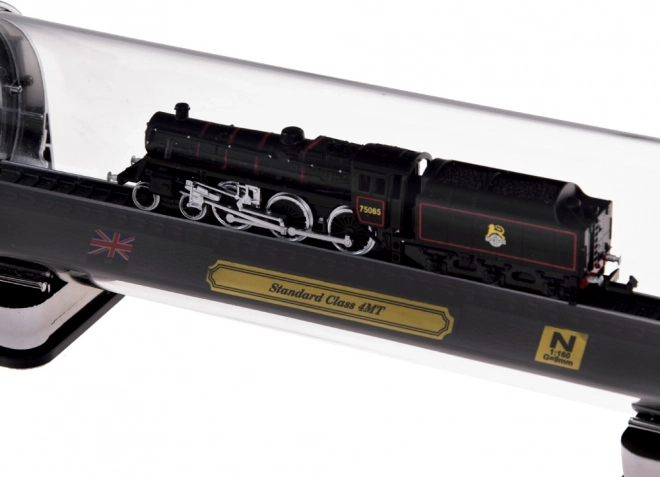 Ovaj detaljni model britanske parne lokomotive STANDARD CLASS 4MT idealan je izbor za ljubitelje željeznice i stilskih dekoracija. Precizna izrada u mjerilu 1:160 ističe autentične detalje, kontrastno lakiranje i fino liniranje kotača. Model je učvršćen na odjeljku tračnica na elegantnom postolju s plaketom, britanskom zastavom i oznakom mjerila.