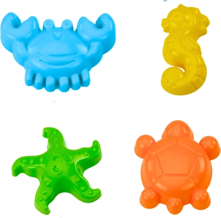 Ergonomska lopatica i grabljice savršeno pristaju dječjim rukama. Set od četiri kalupa (rak, morska zvijezda, morski konjić, kornjača) potiče maštu.
