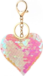 Ovaj privjesak je izrađen u obliku srca i prekriven je obostranim šljokicama u bijeloj i svijetloružičastoj nijansi, koje stvaraju elegantan i sjajan izgled.