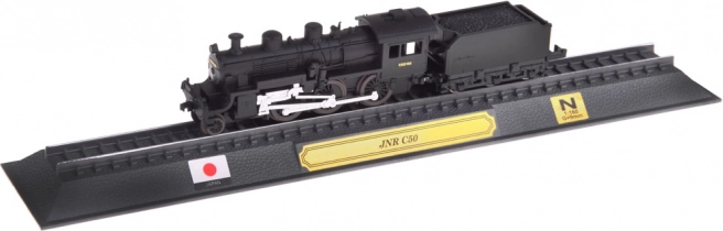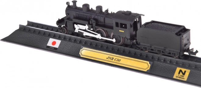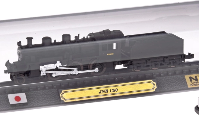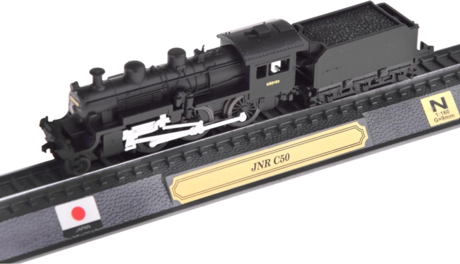 Detaljan model parne lokomotive JNR C50 u mjerilu 1:160 s realističnim elementima karoserije i podvozja na tračničkoj podlozi.