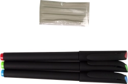 Set sadrži 3 šarena flomastera i masu koja fiksira šablone za papir. Time se sprječava pomicanje i jamče čiste linije bez razmazivanja.