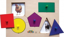Ova drvena ploče puzzle iznimne su edukacijske vrijednosti i zabavnosti. Sadrži 5 geometrijskih otvora za obojene dijelove koji imaju hvataljke za jednostavno držanje.